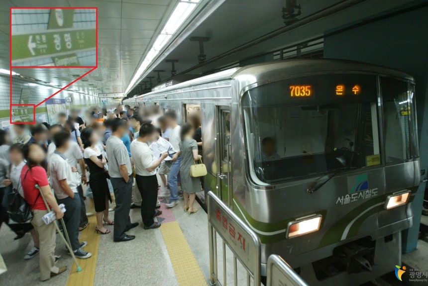 서울 지하철 7호선 광명사거리역 내부 계단의 벽면을 유심히 살펴보면,이처럼 흥미로운 기록 하나를 발견할 수 있다.
