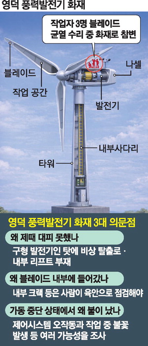 한 관계자는 "로봇 등을 이용해 내부를 점검하는 방식도 있지만 아무래도 사람이 직접 블레이드 내부 상태를 확인하는 게 정확하다 보니 직접 작업을 수행하다 변을 당한 것 같다"며 안타까워했다.