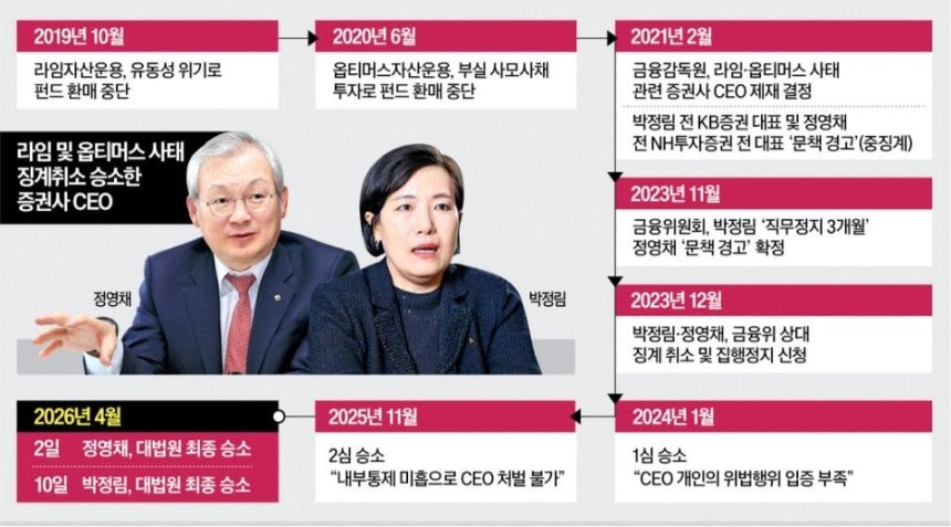 금융당국이 두 CEO를 중징계한 근거는‘내부통제 기준 마련 의무 위반’이었다.고위험 사모펀드 판매 과정에서 관리가 부실했고,그 책임은 최종적으로 CEO에게 있다는 논리다.라임 사태에서는 레버리지 제공과 상품 판매 과정의 관리 부실이,옵티머스 사태에서는 허위 기초자산을 기반으로 한 펀드 검증 실패가 핵심 쟁점으로 지목됐다.