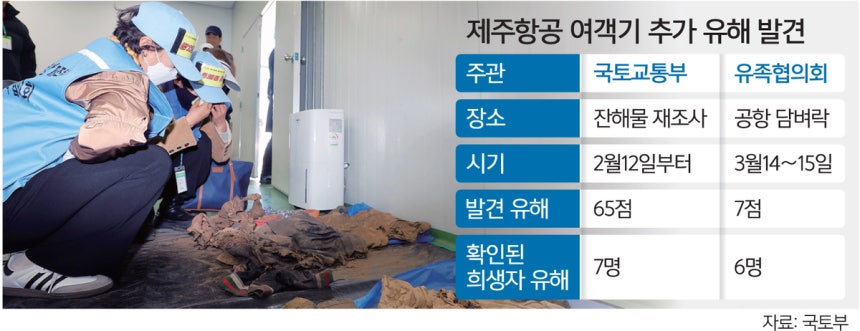 23일 12·29 제주항공 여객기 참사 유가족협의회 등에 따르면 국토교통부는 지난달 12일부터 항공철도사고조사위원회와 전남경찰청 과학수사대 합동으로 잔해물 재조사를 벌여 유해로 추정되는 65점을 발견했다.이 가운데 유전자(DNA) 분석을 거쳐 9점은 희생자 7명의 유해로 확인됐다.