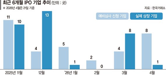 실제 신규 상장한 기업도 지난달 8곳에 이른다.신규상장 기업은 지난해 11월 10곳,12월 13곳에서 올해 1월과 2월에 각각 1곳,0곳으로 눈에 띄게 줄어든 바 있다.공모주 시장은 올 초 전통적 비수기와 함께 중동 사태로 국내 증시 변동성이 확대되자 찬바람을 맞았다.하지만 인공지능(AI) 산업 확대에 따른 반도체 기업 호실적 등에 투자심리가 다시 살아나면서 IPO에 도전하는 기업도 늘어나는 양상이다.