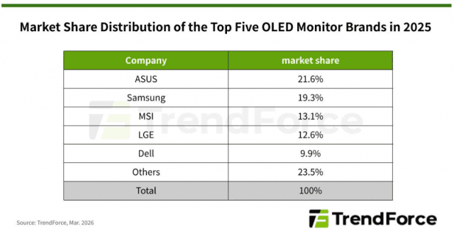 3위는 13.1%의 MSI다.MSI는 최근 수년간 OLED 게이밍 모니터 시장에서 입지를 확대해 왔다.경쟁 심화 속 MSI는 신속한 제품 출시와 다양한 가격대 라인업으로 게이머 수요를 공략 중이다.트렌드포스는 MSI가 하이엔드 OLED 모니터 시장에서 기술 리더십 이미지,주류 브랜드 입지 등을 구축했다고 평가했다.