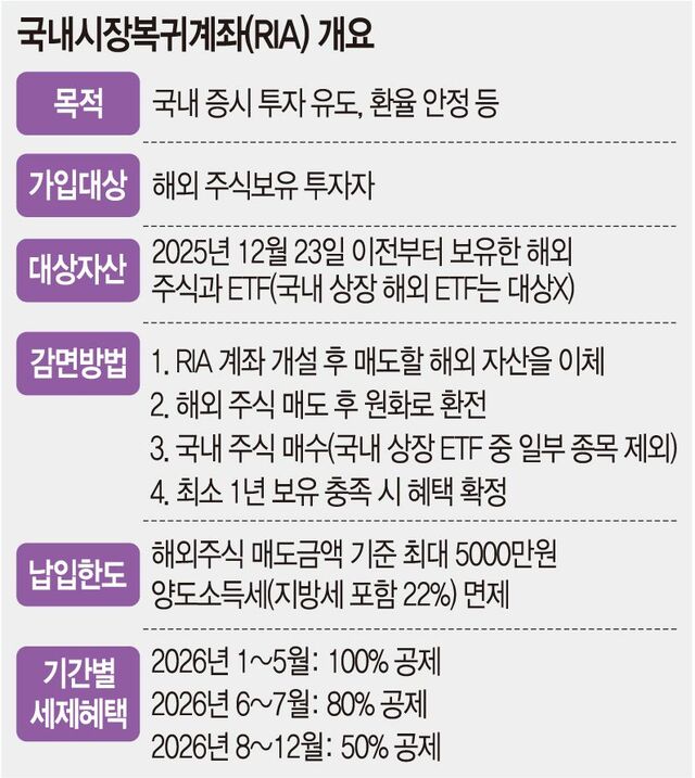 RIA는 서학개미의 국내 주식시장 복귀를 유도하고,타이칸 카지노원·달러 환율안정 등을 목표로 한 정책성 계좌다.해외주식을 보유한 국내 투자자가 해외주식을 매도해 국내 주식에 1년 이상 투자할 경우,최대 5000만원 한도 내에서 양도소득세를 감면한다.세제 혜택은 기간별로 차등 적용한다.올해 5월 말까지 매도하면 해외주식 양도소득세 100%가 공제된다.7월 말까지는 80%,연말까지는 50%로 공제율이 줄어든다.