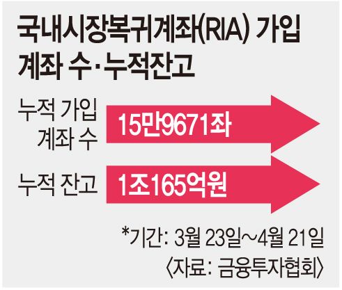 22일 금융투자협회에 따르면 전날 기준 RIA 누적잔고는 1조165억원,누적 가입계좌 수는 15만9671좌로 집계됐다.지난달 23일 RIA 도입 이후 약 한 달 만의 성과다.