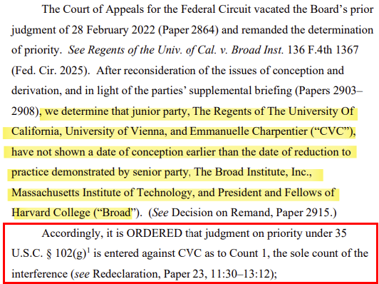 [이데일리 나은경 기자] 미국 특허청 산하 특허심판원(PTAB)이 유전자 편집 기술 크리스퍼 카스9(CRISPR-Cas9) 선발명자를 둘러싼 저촉심사에서 브로드연구소(Broad Institute)의 손을 다시 들어주면서 글로벌 특허 분쟁이 새로운 국면에 접어들었다.미국 UC버클리대학교·오스트리아 빈대학교·노벨 화학상 수상자인 에마뉘엘 샤르팡티에로 구성된 CVC 컨소시엄과 브로드 간 우선권 다툼이 브로드의 승리로 귀결된 것이다.
