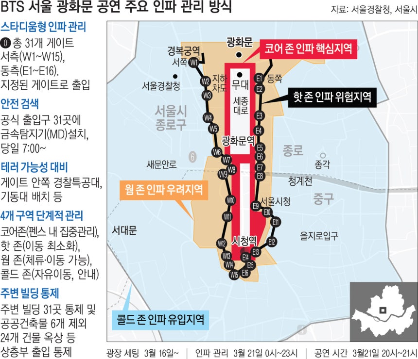 서울경찰청 관계자는 18일 오후 브리핑을 열고 BTS 공연 무대를 관람할 수 있는 구역에‘인파 관리선’을 설정해 수용 인원을 약 10만명으로 관리할 계획이라고 밝혔다.공연 당일 무대를 중심으로 남대문 일대까지 최대 26만명이 몰릴 것으로 예상된다.2002년 월드컵 거리 응원 이후 최대 규모다.
