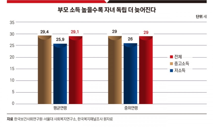실제로 부모 곁을 떠나는 시점은 갈수록 늦어지고 있다.서울연구원이 2024년 발표한‘출생 코호트별 35세 동거 비율’을 보면 1980년대생의 동거 비중은 이전 세대보다 월등히 높다.첫 취업과 결혼,출산 등 성인기의 주요 전환점이 20년 전보다 2~3년씩 뒤로 밀리면서 독립 자금을 모으는 기간 자체가 길어진 영향이다.