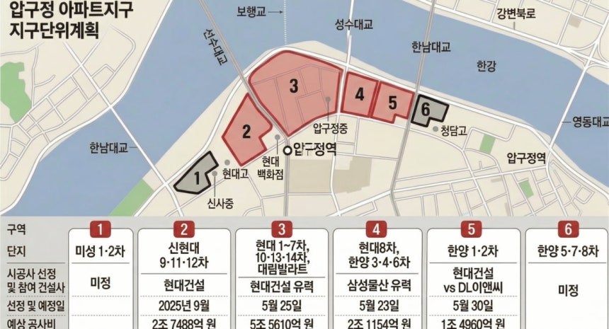 건설사들의 '선택과 집중' 전략에 따라 압구정 재건축 수주전의 윤곽은 어느 정도 드러난 상태입니다.2구역은 '압구정의 강자'로 꼽히던 현대건설이 지난해 9월 일찌감치 깃발을 꽂았고,가장 규모가 큰 3구역도 현대건설의 단독 입찰 가능성이 높습니다.삼성물산이 책임준공 확약서라는 파격 카드를 던진 4구역은 삼성의 단독 입찰 가능성이 거론됩니다.
