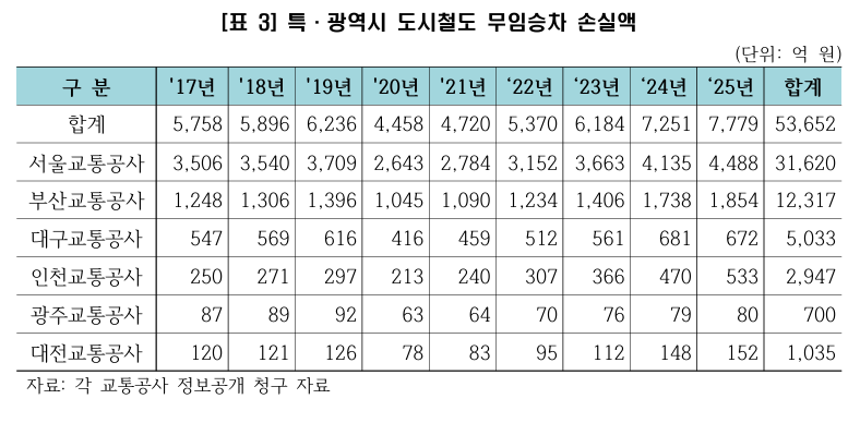 25일 나라살림연구소 분석에 따르면 2017년부터 2025년까지 6개 도시철도 운영기관의 무임승차 손실액은 총 5조3652억원에 달했다.특히 2025년 한 해 손실액만 7779억원으로 집계됐다.